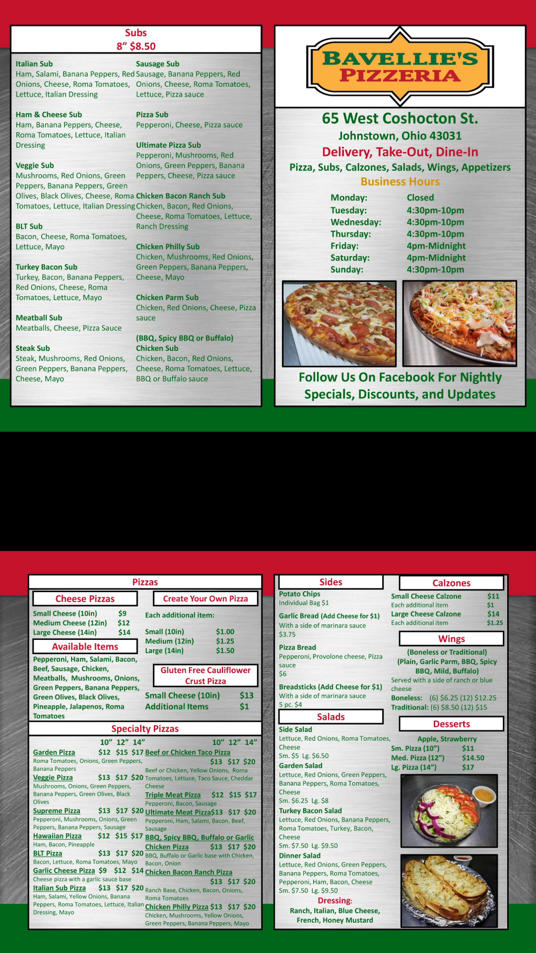 Bavellies Pizzeria Johnstown Delivery, Take-Out, Dine-In Pizza, Subs, Calzones, Salads, Wings, Appetizers Call Now (740-809-1102) Hours: Sun,Tue,Weds,Thurs 4:30-10:00; Fri-Sat 4:00-12:00 Order Online Menu
