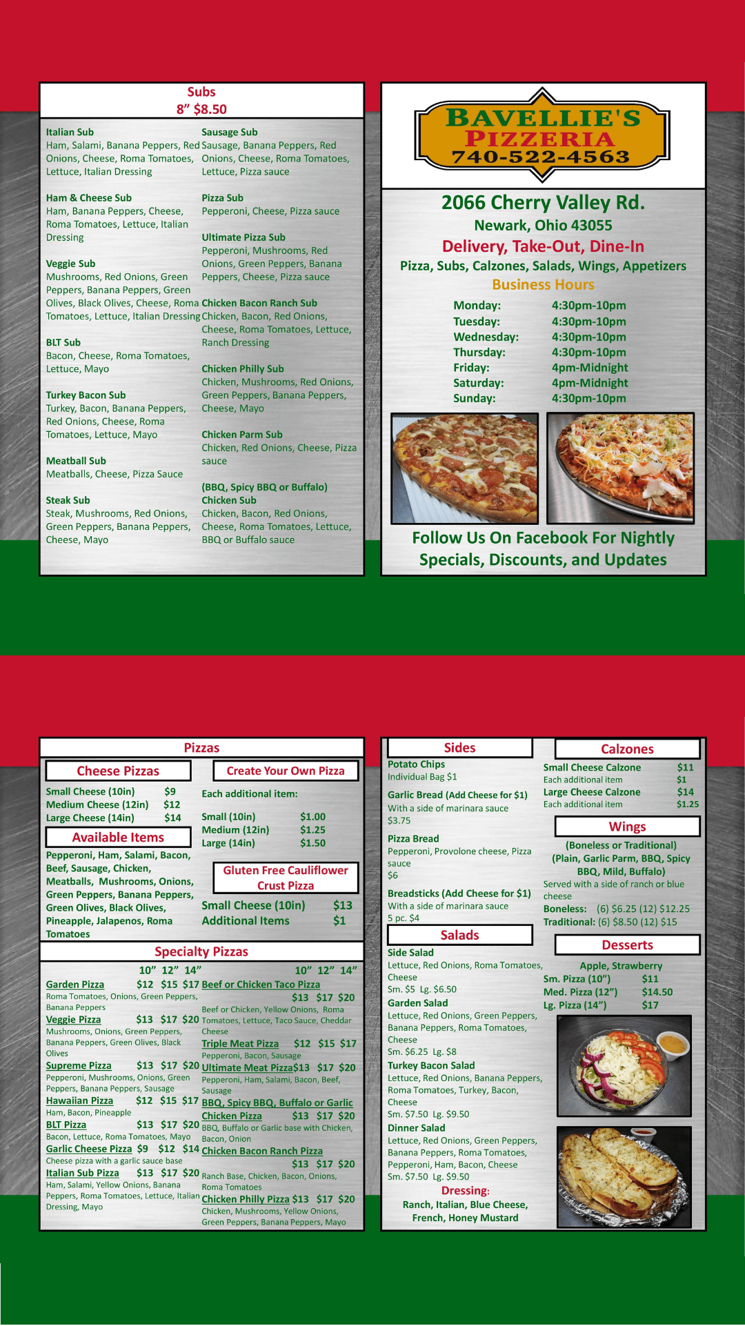 Bavellies Pizzeria Newark Delivery, Take-Out, Dine-In Pizza, Subs, Calzones, Salads, Wings, Appetizers Call Now (740-522-4563) Hours: Sun-Thurs 4:30-10:00, Fri-Sat 4-12:00 Order Online Menu