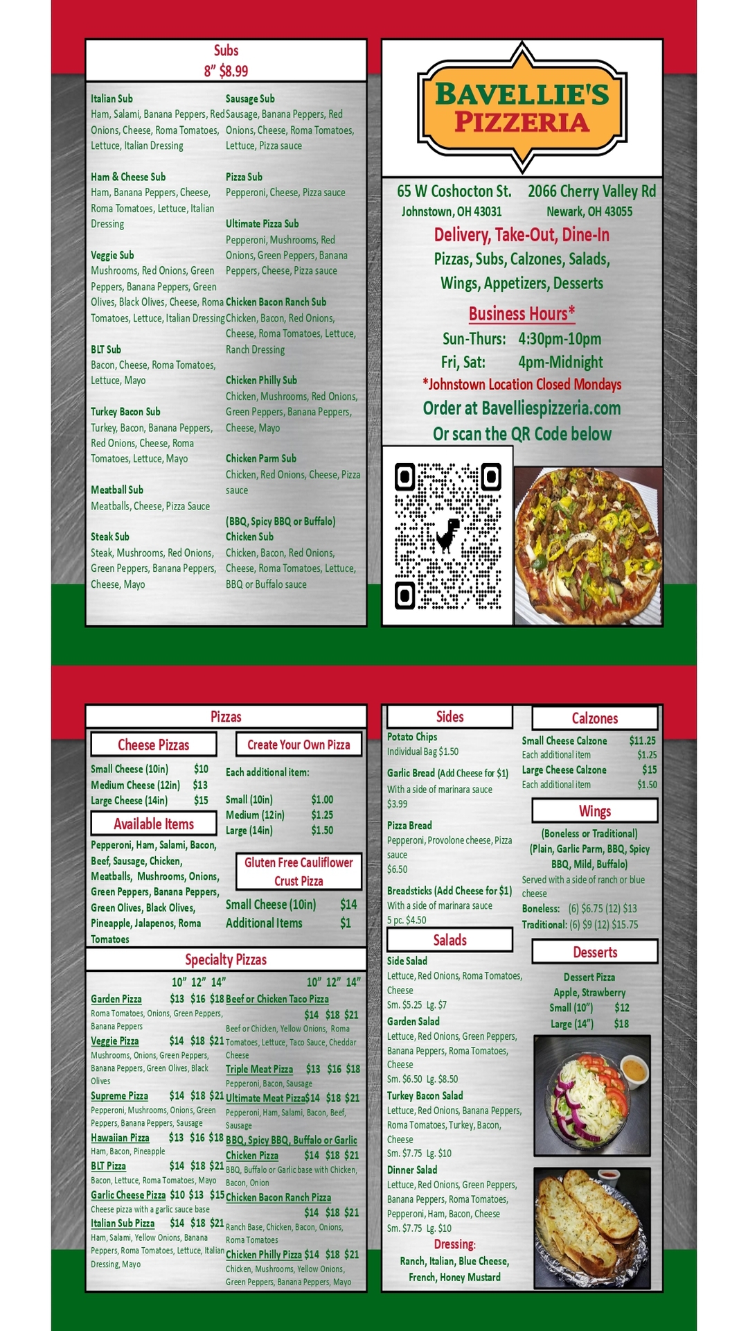 Bavellies Pizzeria Newark 2066 Cherry Valley Rd, Newark, OH 43055 Delivery, Take-Out, Dine-In Pizza, Subs, Calzones, Salads, Wings, Appetizers Call Now (740-522-4563) Hours: Sun-Thurs 4:30-10:00, Fri-Sat 4-12:00 Order Online Menu